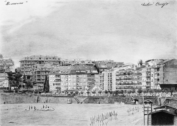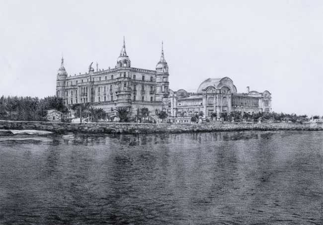 "A Toxa" hotel y balneario antiguos.Lapiz grafito sobre papel. La isla de a Toxa está situada en el Salnes, provincia de Pontevedra en el termino municipal del concello de O Grove. A lo largo de los años ha sufrido muchas transformaciones con el casino y los complejos turísticos. Aquí podemos ver como era antiguamente, puesto que en la actualidad ha sido totalmnte reformada.