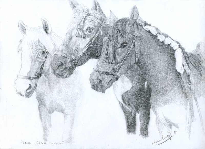 Caballos de Jerez. Lápiz grafito. Caballos acicalados para el paseo en la feria del caballo de Mayo en Jerez de la Frontera.