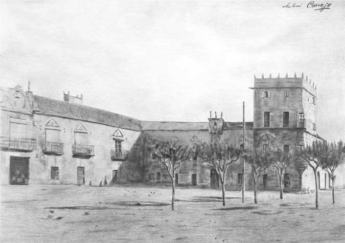 "El pazo Fefiñanes" Cambados. Lápiz grafito. Imagen del Pazo y la plaza antes de la actual remodelación. Ubicación comarca del Salnés, Pontevedra