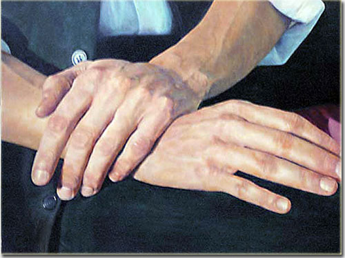 Estudio de las manos de Foks. Óleo sobre tabla 70 x 50 cms. Foks es Javer Gómez teclista, percusionista y compositor asturianu.