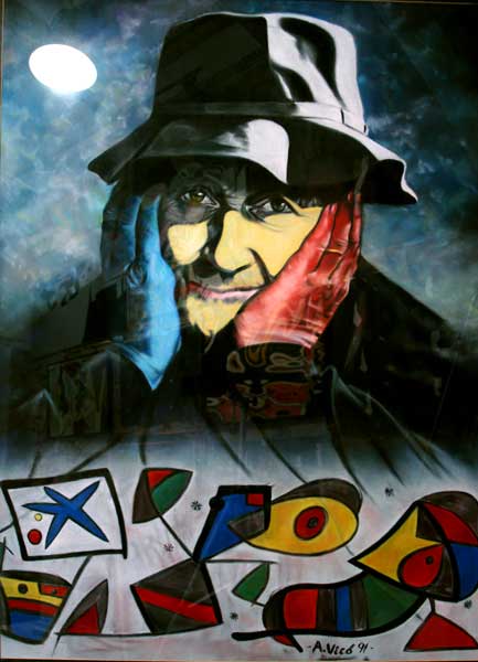 Joan Miró con su obra pintada para la Caixa en la que aprece el anagrama de la entidad. Pastel sobre papel. Expuesto en la Caixa Barcelona, en Rest Neyrasy en calle Tigre Barcelona